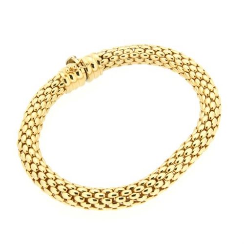 Bracciale donna FOPE modello Kaleida in oro giallo 750% (18 Kt.) lucido a maglia tubolare snodata (maglia Fope) con chiusura a cassetta con otto di sicurezza personalizzata con logo. Lunghezza 19 cm. Diametro maglia 7 mm. Peso 27,2 grammi. Modello depositato. Prodotto nuovo con scatola certificato di garanzia e autenticità originali.