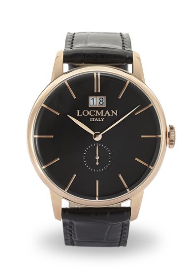 Orologio in acciaio, diametro 40 mm, cinturino in pelle stampata con chiusura ardiglione personalizzata, quadrante con secondi al sei e grand data su doppia finestra, movimento quartz, water resistant 5 atm