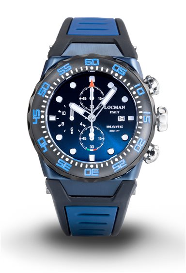 L‘orologio MARE 300MT rappresenta l’anima subacquea e sportiva di LOCMAN e si arricchisce, per la prima volta, dei contatori di ore, minuti e secondi, complicazioni che ne aumentano la tecnicità e che confermano gli alti standard qualitativi raggiunti da LOCMAN nell’ambito dell’orologeria subacquea. Mare 300MT si contraddistingue per la forte personalità e per il design deciso e funzionale, tipico di LOCMAN. Con una cassa di 44 mm in titanio e acciaio AISI 316L, è dotato di una ghiera girevole unidirezionale, che permette la misurazione delle immersioni indicando i tempi di permanenza in profondità e di risalita in superficie. Impermeabile fino a 300 metri (30 ATM), l’orologio è dotato di corona e pulsanti a vite, per evitare accidentali azionamenti in acqua e a garanzia quindi della massima impermeabilizzazione. Il quadrante, con indici applicati e la bandiera italiana posta a ore 6 è sormontato da un vetro minerale con trattamento zaffiro, che ne aumenta resistenza e trasparenza.