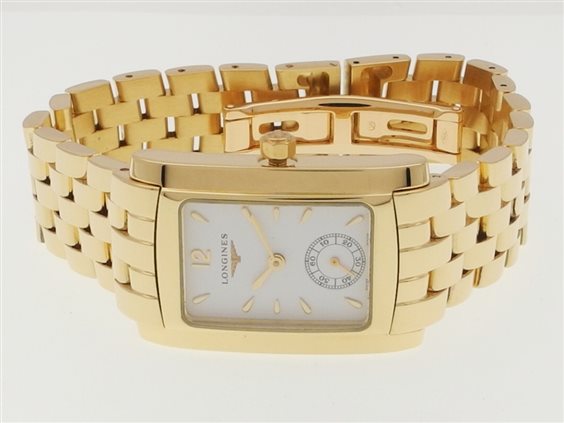 Orologio Longines collezione Dolcevita, cassa e bracciale in oro giallo 18 kt., vetro zaffiro antigraffio, dimensioni cassa (anse comprese): 33 x 22 mm, dimensioni cassa (senza anse): 26 x 22 mm, lunghezza: 18,5 cm. Peso: 83 gr.