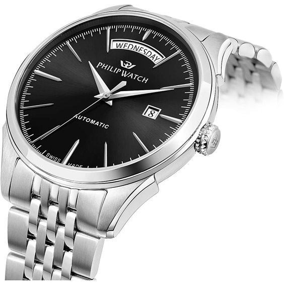 OROLOGIO PHILIP WATCH della collezione ROMA. Movimento solo tempo automatico day date STP 4-13. Rotore personalizzato con monogramma inciso. Cassa acciaio da 41mm con finitura lucida e satinata, fondello fissato con 6 viti e movimento a vista. Vetro zaffiro antiriflesso. Bracciale in acciaio con fibbia a farfalla con pulsanti. Swiss made, Water resistant: 5 atm.