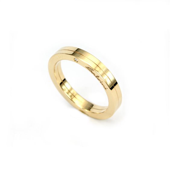 anello Salvini mod.20019545 collezione Noi,in oro giallo 18 Kt.,allo 7501000 con due Diamanti taglio Brillante ai 2 lati, totale Kt. 0,02 H. le due fedi imperniate si aprono per lasciare vedere un segreto da condividere o i semplici nomi e data.