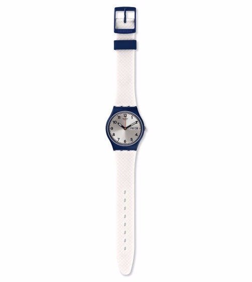 Ispirato ai colori della marina, WHITE DELIGHT (GN720) sfoggia un design sportivo blu navy e bianco, una cassa navy scuro combinata con passante e fibbia e un cinturino bianco brillante con linee incrociate a rombo. Gli indici e i numeri in nero risaltano con vivace eleganza sul quadrante argentato scintillante, mentre il datario a ore 3 completa il look.