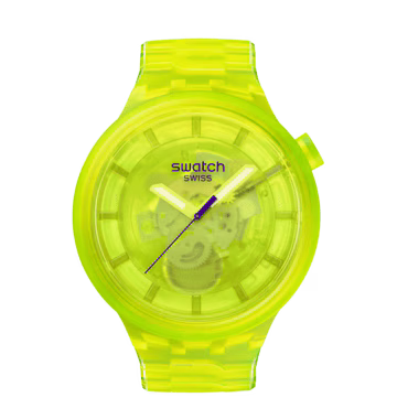 Questo orologio giallo oversize sfoggia un look trasparente in tutte le sue parti, dalla cassa, al quadrante, alla lunetta al bracciale biosourced con fibbia a farfalla. Il quadrante giallo trasparente biosourced offre una visione del movimento, mentre le lancette gialle fosforescenti di ore e minuti e la lancetta viola a contrasto dei secondi indicano l'ora sotto il vetro biosourced.