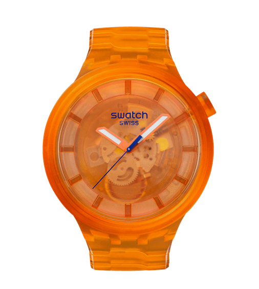 Questo orologio oversize arancione vanta un look completamente trasparente, dalla cassa, al quadrante, alla lunetta e al bracciale biosourced con fibbia a farfalla. Il quadrante arancione trasparente biosourced offre una visione del movimento, mentre le lancette delle ore e dei minuti arancioni fosforescenti e la lancetta dei secondi blu a contrasto indicano l'ora sotto il vetro biosourced.