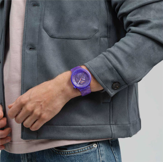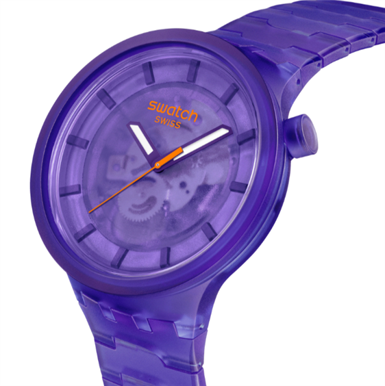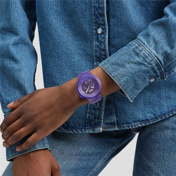 Questo orologio oversize viola sfoggia un look completamente trasparente, dalla cassa, al quadrante, alla lunetta e al bracciale biosourced con fibbia a farfalla. Il quadrante viola trasparente biosourced offre una visione del movimento, mentre le lancette delle ore e dei minuti viola fosforescenti e la lancetta dei secondi arancione a contrasto indicano l'ora sotto il vetro biosourced.