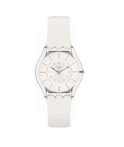Questo orologio ultrasottile presenta un quadrante bianco con indici color argento lucido e vetro biosourced racchiuso in una cassa trasparente biosourced. Il cinturino e il passante bianchi si abbinano al quadrante, mentre la fibbia trasparente completa la cassa.