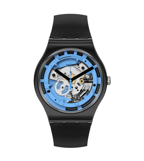 BLUE ANATOMY Il cinturino in silicone nero e la cassa in plastica nera su questo orologio fanno da cornice a una cassa interna con stampa blu vivace ed elementi del movimento visibili di colore argento. SUOB187