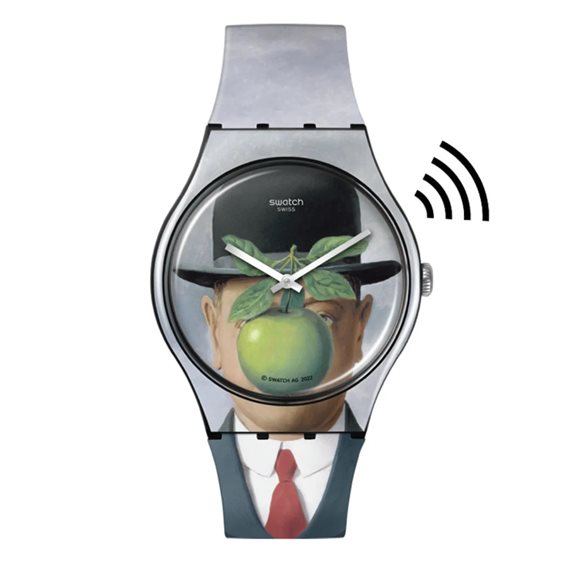 THE SURREAL PAY! THE SURREAL PAY! riproduce l’opera surreale di René Magritte, Le fils de l’homme (il figlio dell’uomo) stampata in continuum sulla parte anteriore del quadrante multicolore, della cassa e del cinturino. Il retro del cinturino gioca con la natura surreale dell’opera, usando la frase "Ceci est une Swatch avec une pomme." (“Questo è uno Swatch con una mela”). Anche il passante è stampato con il nome dell’artista. Questa versione è disponibile anche con l’opzione SwatchPAY!. Le Fils de l’homme (1964), oil on canvas, 116 x 89 cm (Collection privée). © Succession René Magritte - SABAM, Belgium, 2023 / BKW Editions SVIZ103-5300