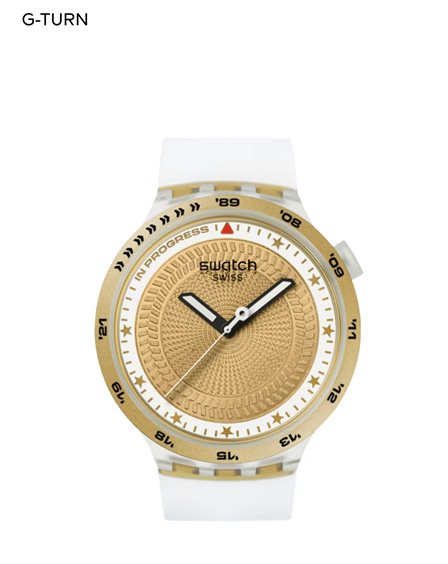 G-TURN Questo orologio sportivo oversize è stato creato in collaborazione con l'atleta del Proteam Swatch Matthias Dandois. Il segnatempo presenta un quadrante strutturato color oro con stampa multicolore, dettagli fosforescenti, lancette delle ore e dei minuti nere fosforescenti e lancetta dei secondi bianca. La cassa trasparente opaca biosourced con vetro biosourced è accentuata da una lunetta trasparente opaca biosourced con stampa multicolore. Il cinturino trasparente opaco con inserto color oro opaco presenta passanti trasparenti color oro opaco e una mezza fibbia sempre in oro opaco. SB05K105