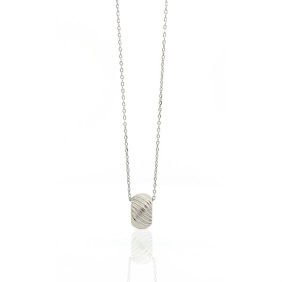 Collier di catena forzatina in argento bianco 925 lungo 44 cm con pendente ad anello bombato decorato da righe diagonali scanalate e chiusura a moschettone, regolabile grazie ad anelli di allungamento. Un gioiello dalla linea essenziale e discreta da portare sempre. Si abbinerà facilmente ad ogni tuo capo e ad ogni tuo look, casual o elegante che sia. Divertiti ad indossarla insieme agli altri pendenti nei vari colori. Crea e mixa il tuo stile per essere sempre unica!