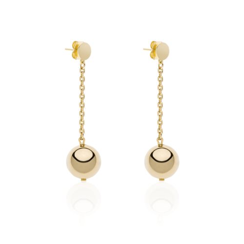 Orecchini lunghi in catena con pendente finale a sfera, bagno in oro o argento. Chiusura con perno e farfallina, lunghezza 6,00 cm.