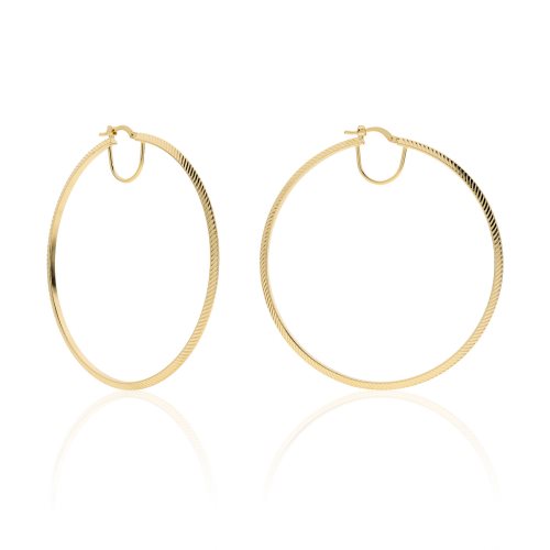 Orecchini a cerchio in finitura diamantata. Chiusura a baionetta. Diametro 6,00 cm.